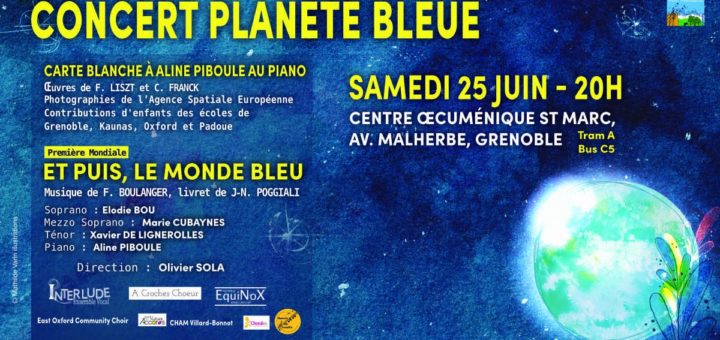 PLANÈTE BLEUE concert spectacle samedi 25 Juin à 20 h au Centre Œcuménique Saint Marc, 6 avenue Malesherbes à Grenoble. « Depuis l’espace, nous avons le meilleur...
