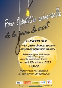 Conférence organisée par les associations Action des Chrétiens pour l’Abolition de la Torture- ACAT, Amnesty International, La Ligue des Droits de l’Homme Fédération de l’Isère, La Ligue de Défense des Droits de l’Homme en Iran et le Mouvement de la paix.