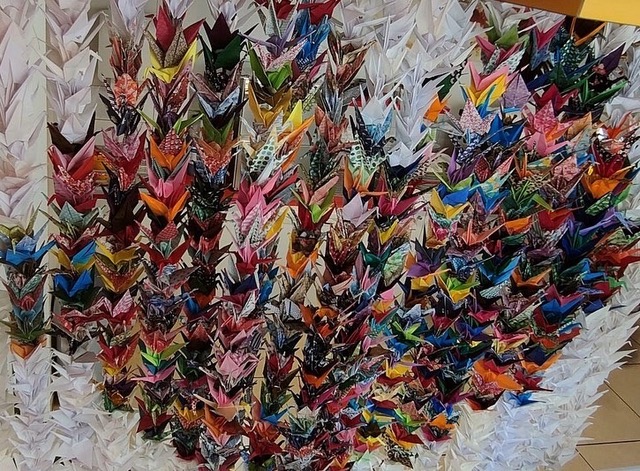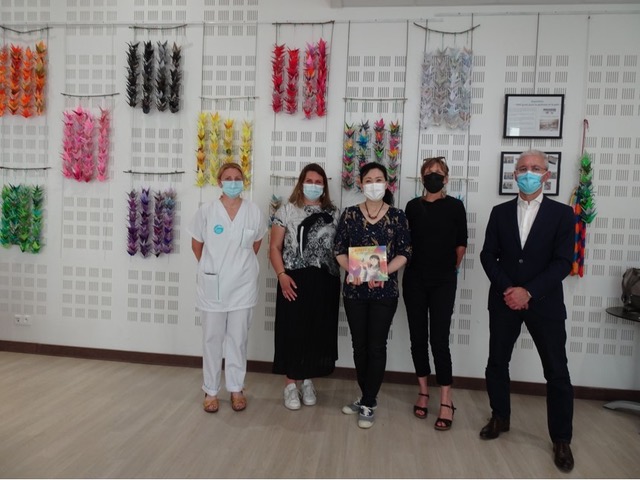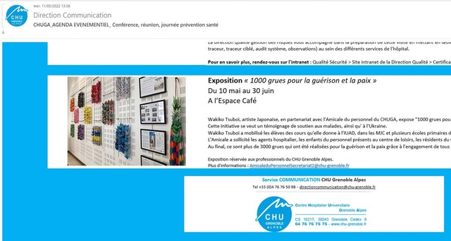 1000 grues en origami pour la guérison et la paix sont en 1er exposition au CHU dans Espace Café du personnels, l’exposition n’est pas publique pour le moment ,elle va être exposé dans le Hall Vercors à Hôpital Nord (Michallon) pour grand publique mois de juillet et août pour tout l’été! Merci pour la participation pour la paix!