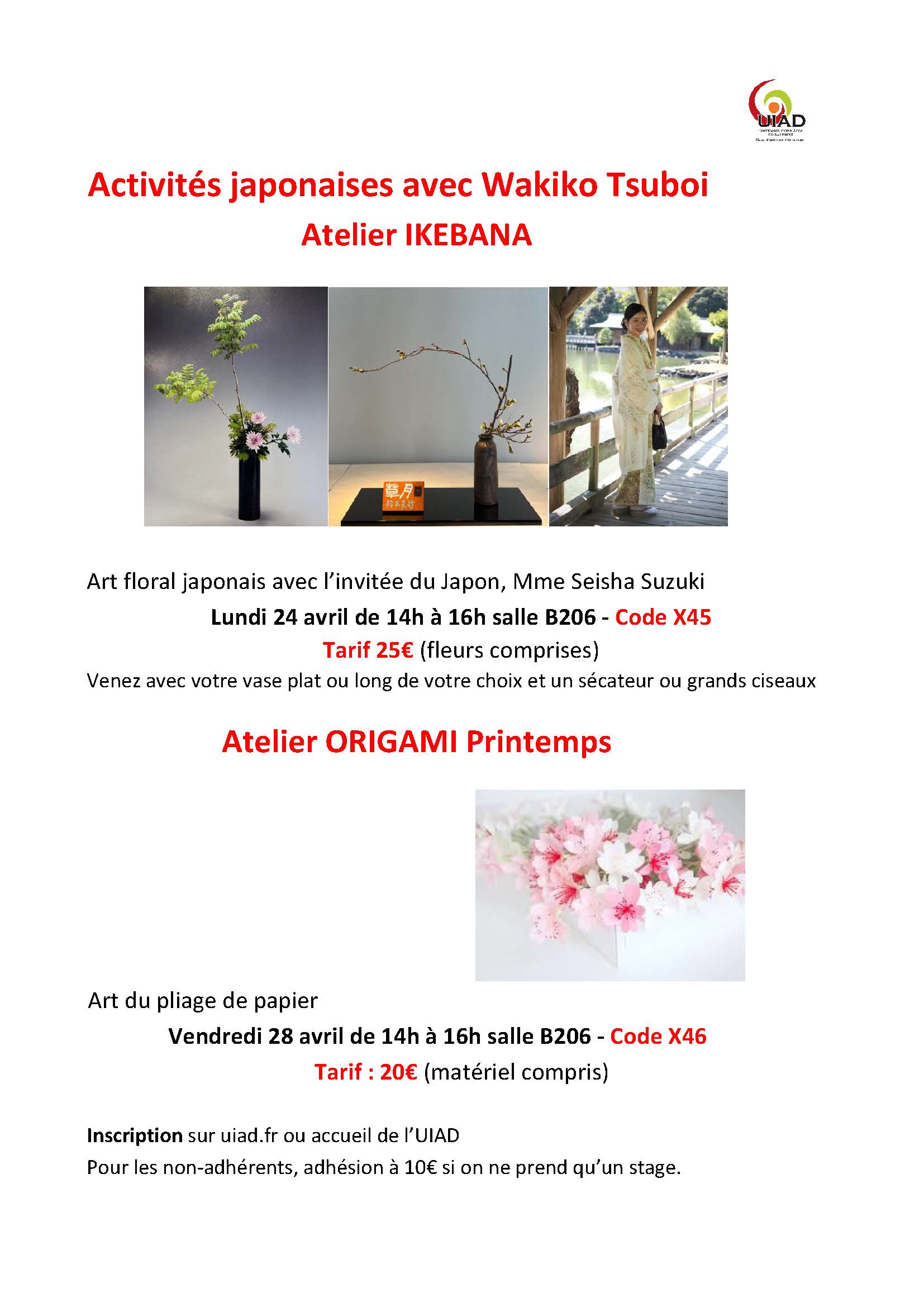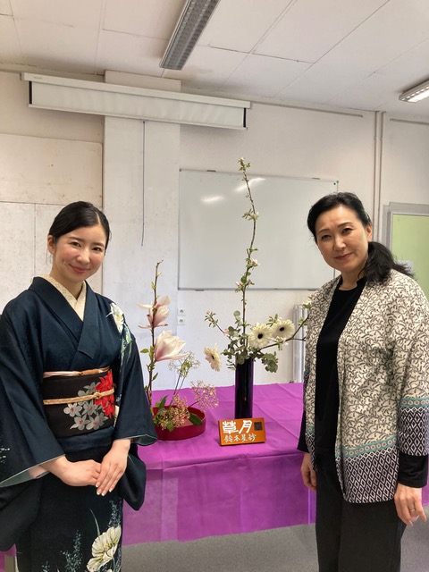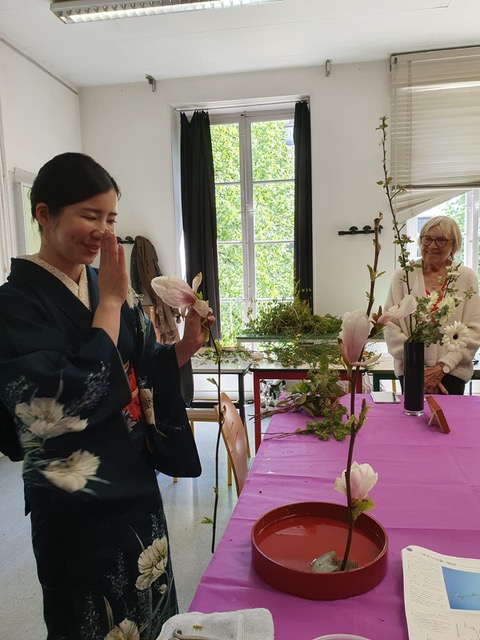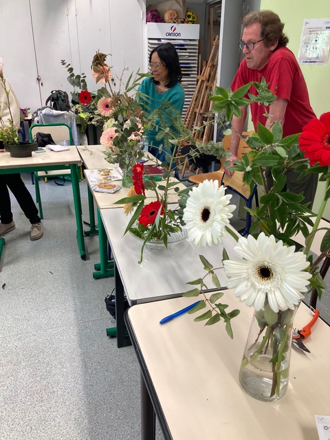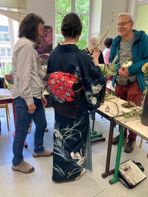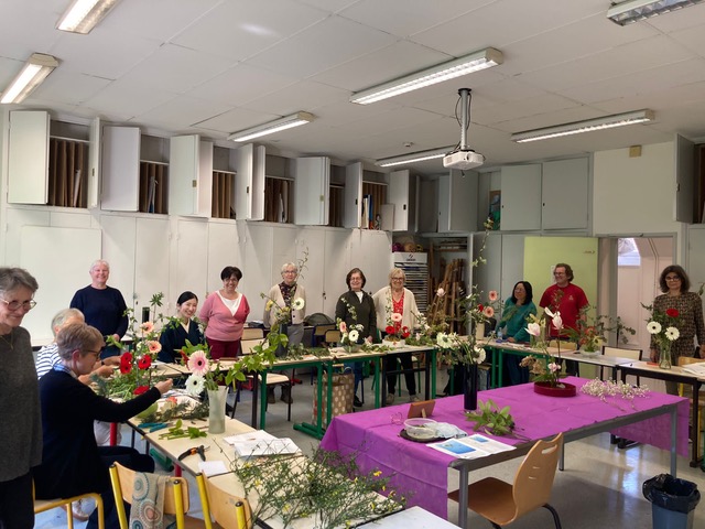 La réponse : une douzaine d’élèves l’ont trouvée en participant à l’atelier organisé à l’UIAD par Wakiko Tsuboi qui avait invité Seisha une jeune professeure d’ Ikebana venue de Tokyo pour partager ses connaissances et nous initier à cet art traditionnel japonais. Cours théorique (histoire, techniques) mais aussi démonstration par Seisha qui réalisa deux compositions. Puis travaux pratiques exécutés avec enthousiasme par les élèves débutants ou plus experts.