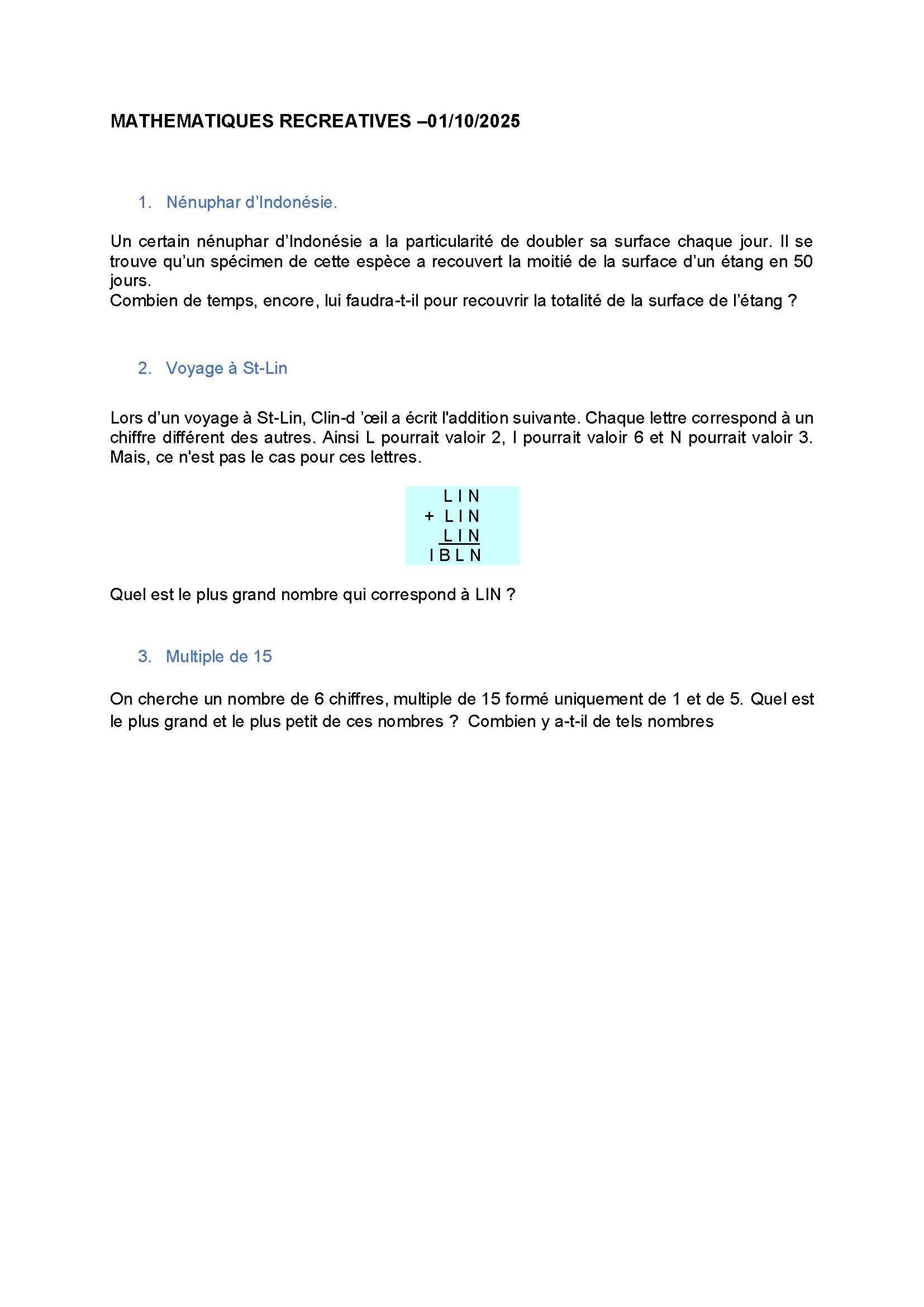 Mathématiques récréatives du 01/10/2025