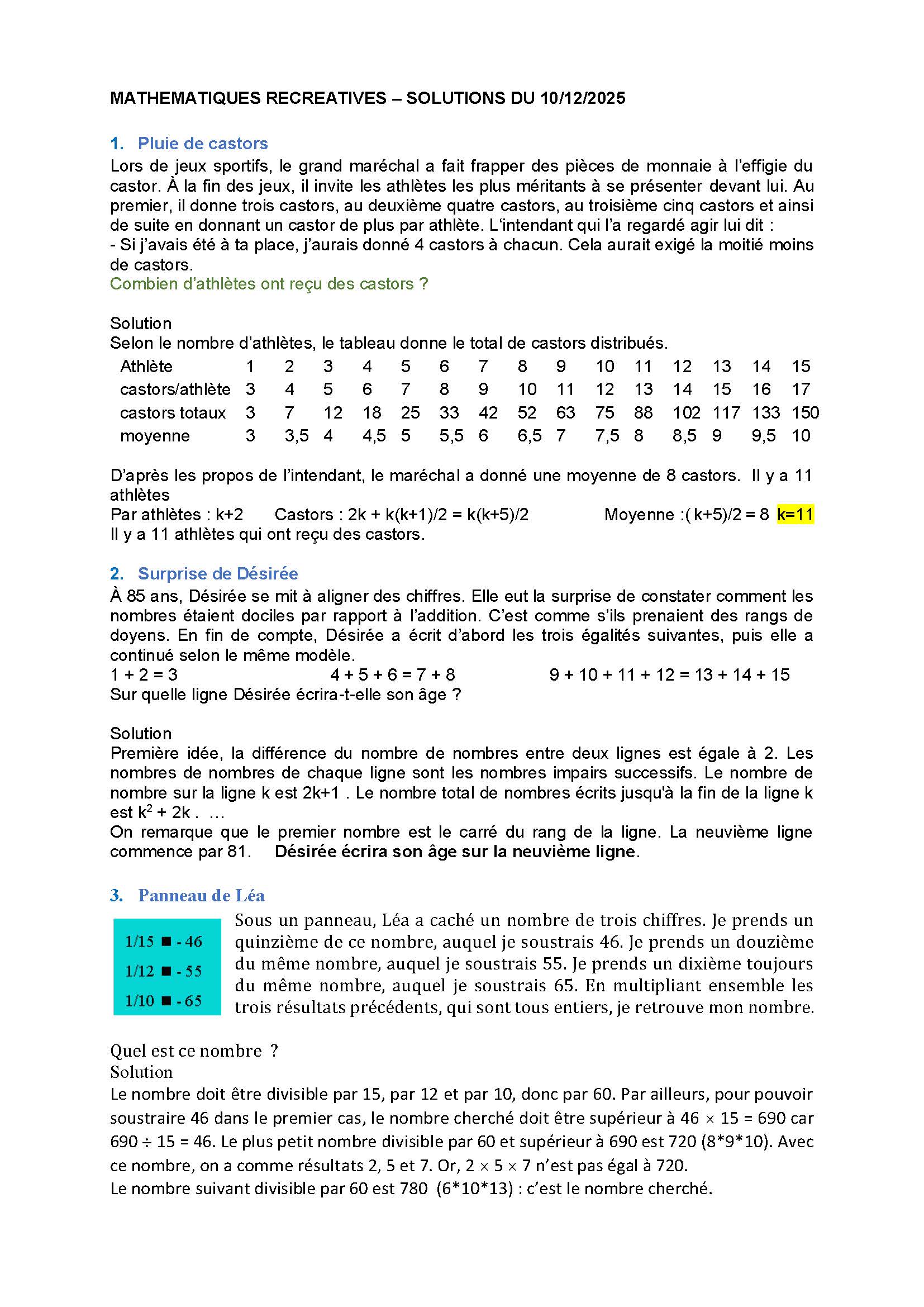 Mathématiques récréatives – solutions du 10 décembre 2025