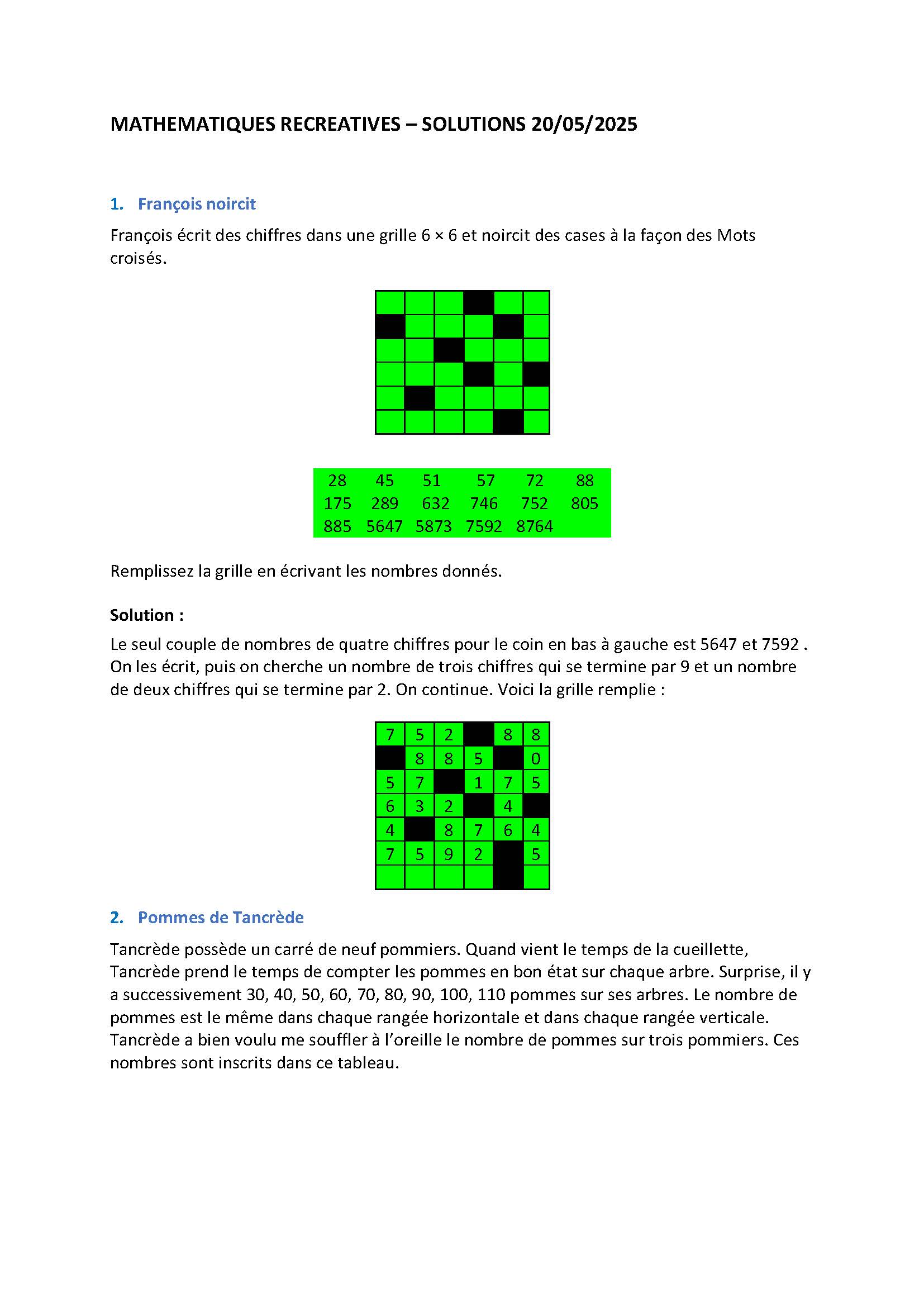 1- François noircit …Pommes de Tancrède etc… les solutions « site du 13 mai » sont celles du 6 mai.