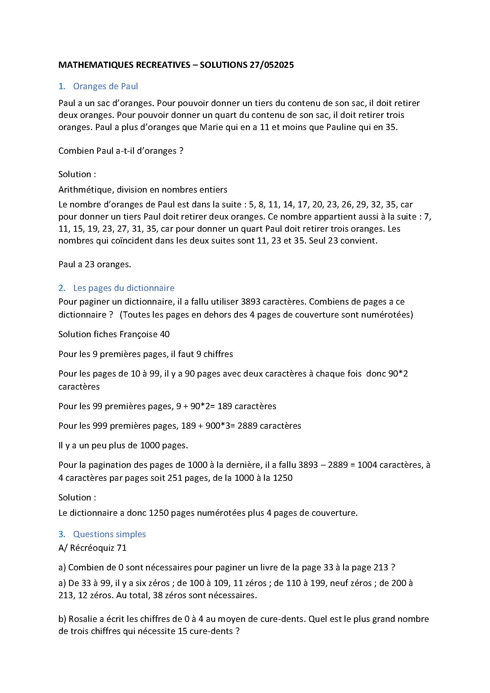 La semaine dernière Christophe Kiény vous avait proposé ses “Mathématiques récréatives”, voici les solutions des exercices du 20 mai :