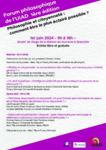 Philosophie et citoyenneté par Marc Tilly et Thierry Ménissier par Jean-Jacques Menthonnex · 28 mai 2024 De Marie-Noëlle Nauleau : Voici une invitation pour le forum de philosophie du samedi 1er juin ainsi que le programme détaillé de cette journée et les ouvrages majeurs des intervenants Affiche du Forum Philo UIAD 1er juin 2024
