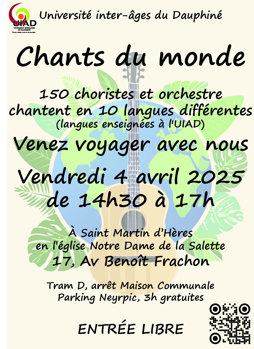 L’UIAD organise sur la commune de St Martin d’Hères, le vendredi 04 avril 2025 de 14h30 à 17h, en l’église ND de la Salette, une représentation de Chant choral en dix langues différentes. Depuis des semaines, les enseignants en langues étrangères de l’UIAD (Japonais, Russe, Grec et les 4 langues européennes) répètent avec leurs élèves, dans les langues enseignées, deux ou trois chansons. S’ajouteront à ces centaines d’élèves, les deux chorales « Chanter en Anglais » et « Chanter en Français »