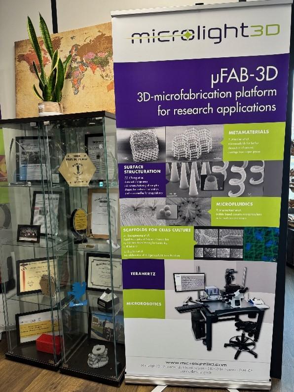 Accueillis par Denis Barbier, Président de MICROLIGHT3D, nous avons découvert les secrets de leur technologie. Leur approche repose sur des techniques de pointe, comme la photopolymérisation à deux photons et d’autres méthodes de micro fabrication par laser. Ces procédés permettent de créer des structures 3D d’une précision inégalée, à une échelle quasi moléculaire.