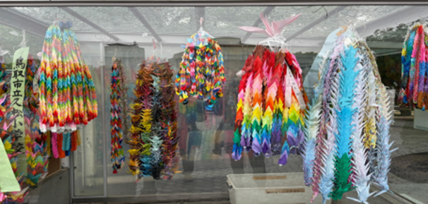 La grue, en origami, est un autre symbole de paix qui fait écho à l’histoire de Sadako Sasaki, petite fille décédée à 12 ans des suites d’une leucémie. Une sculpture lui est dédiée ainsi qu’à tous les enfants victimes du bombardement.